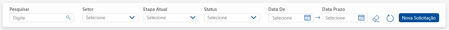 Na tela principal de listagem das solicitações, estão disponíveis filtros para refinar a pesquisa.
