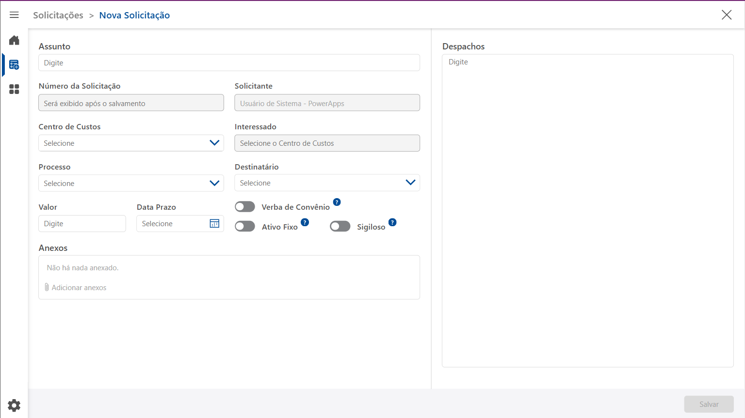 Após abrir a tela, preencha as informações necessárias. O sistema gerará automaticamente o Número da Solicitação, o campo Data (com a data atual), o Interessado e o Responsável pelo Centro de Custo.