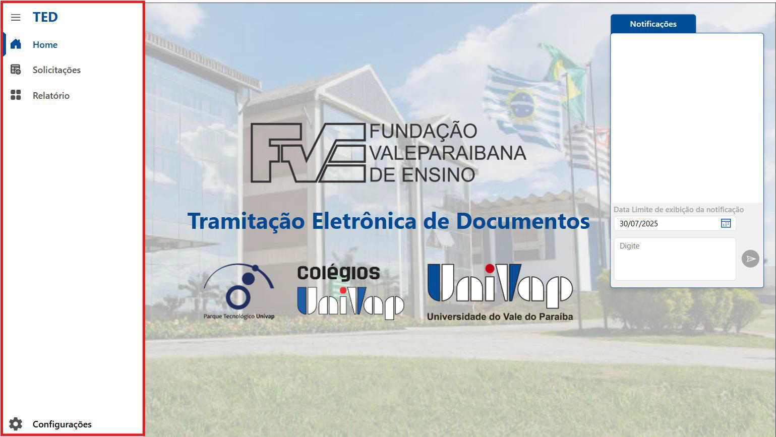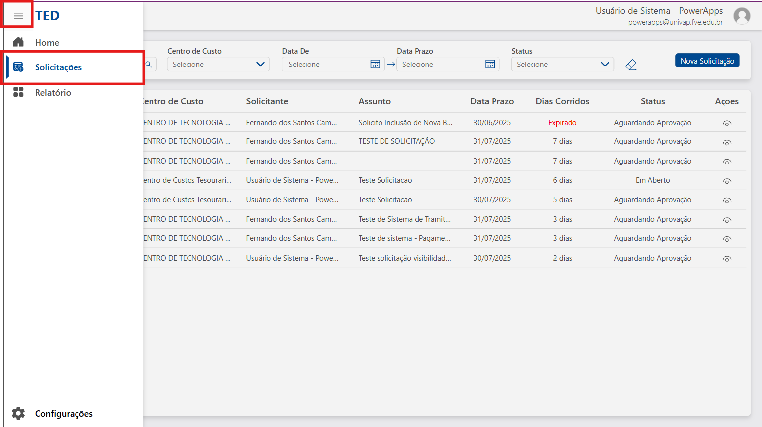 O sistema enviará notificações por e-mail sobre o status da solicitação (envio, aprovação, recusa, etc.).