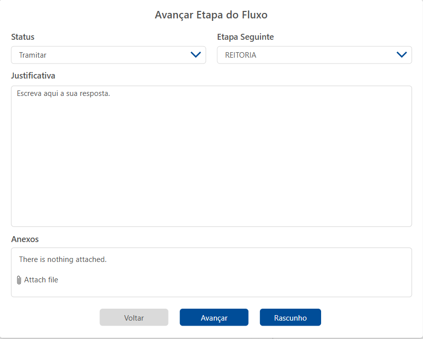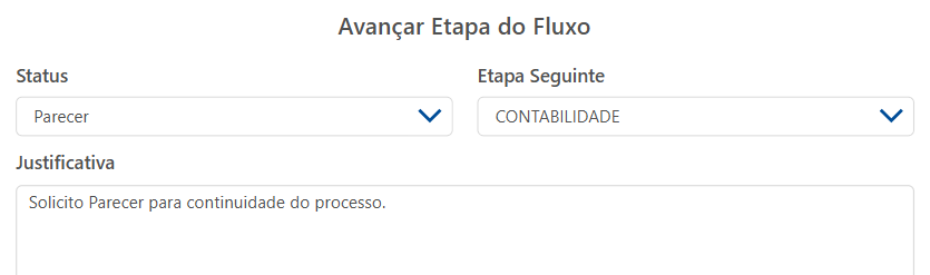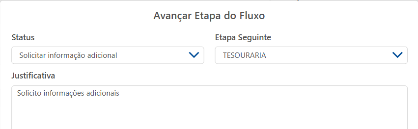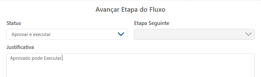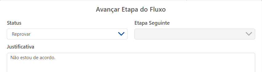 3. Será necessário selecionar o Status, a Etapa Seguinte e informar a Justificativa no campo de texto.