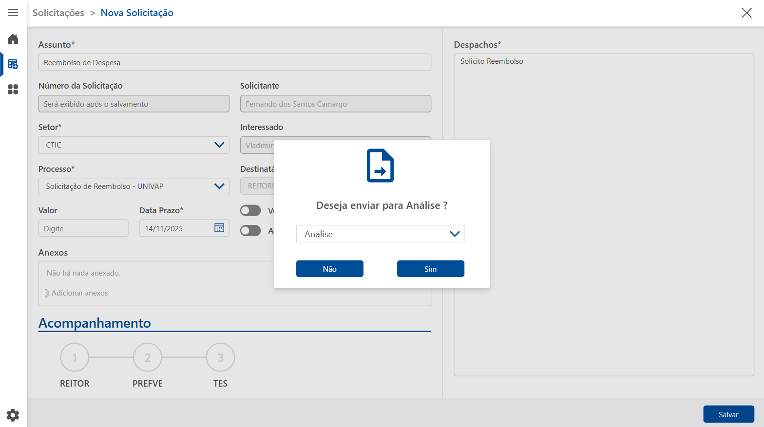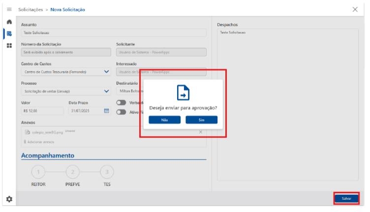 2. Será exibida uma tela de confirmação de envio. Se você clicar em “Não”, a solicitação será salva com o status “Em Aberto”