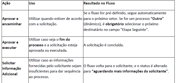 Aprovar e executar: Utilizar caso seja o fim do processo e que a solicitação está aprovada ou executada.