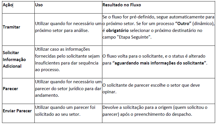 Solicitar informações adicionais: Utilizar caso precise de informações adicionais de outro setor que não esteja no processo para dar sequência.