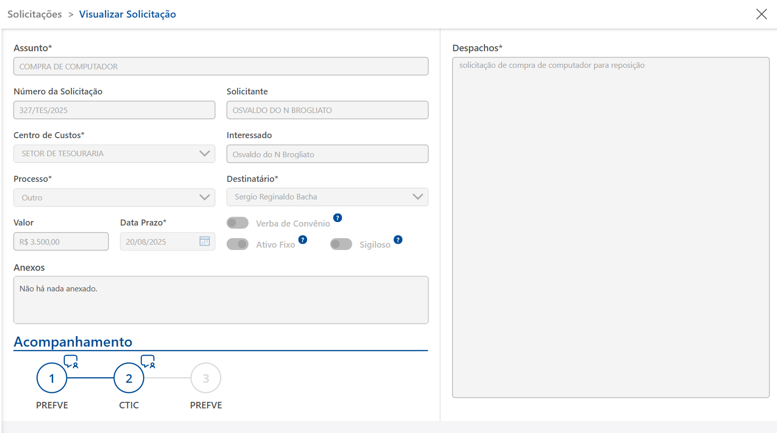 Ao abrir a solicitação, o usuário poderá visualizar todas as interações e decisões de forma cronológica. O sistema registra todas as interações e decisões (aprovação, recusa, comentários, etc...), incluindo a data e hora da ação de cada aprovador.