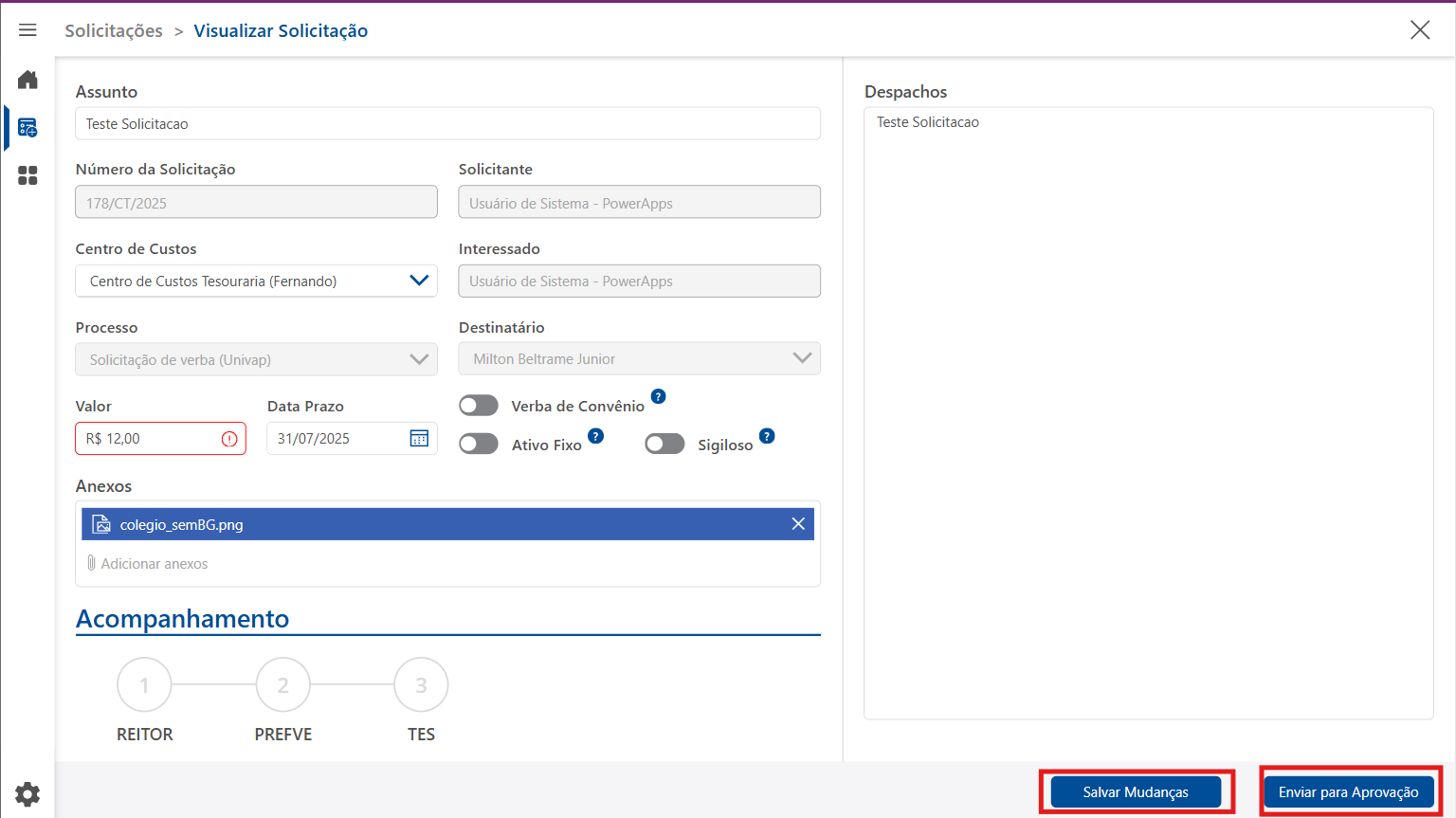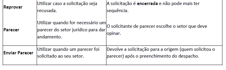 Reprovar: Utilizar caso queira reprovar a solicitação que foi feita. Nesse caso a solicitação é encerrada não podendo mais dar sequência.