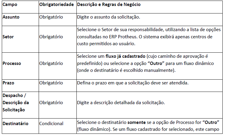 Os campos obrigatórios são: Assunto, Centro de Custos (lista de opções do Protheus), Processo, Prazo e Despacho (Descrição da Solicitação)