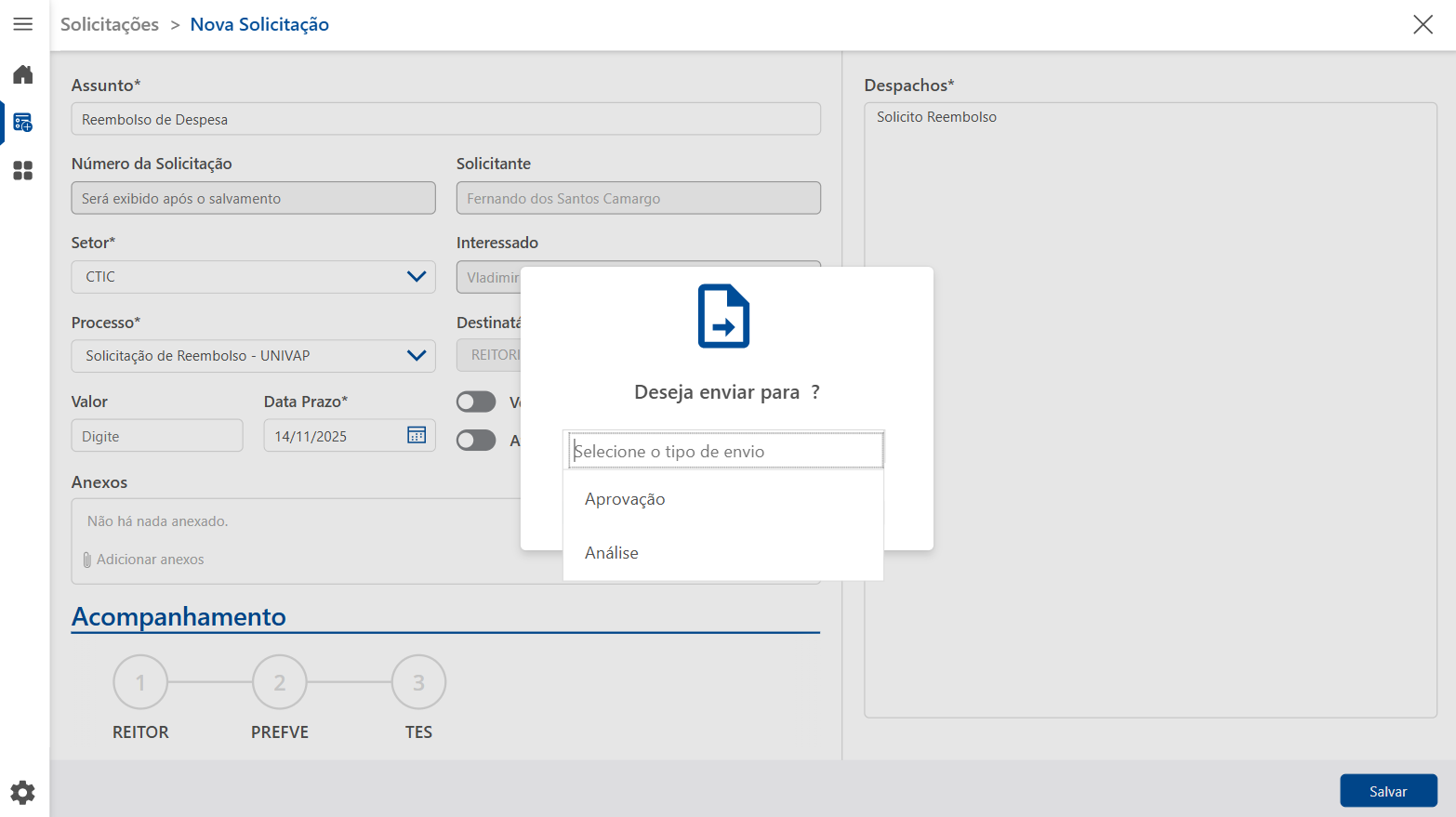 Depois de conferir todas as informações, clique em “Salvar”. Você será apresentado à opção de selecionar o Tipo de Tramitação. A escolha correta é fundamental, pois ela define quais ações o destinatário (a pessoa que receberá e atuará na solicitação) poderá realizar.